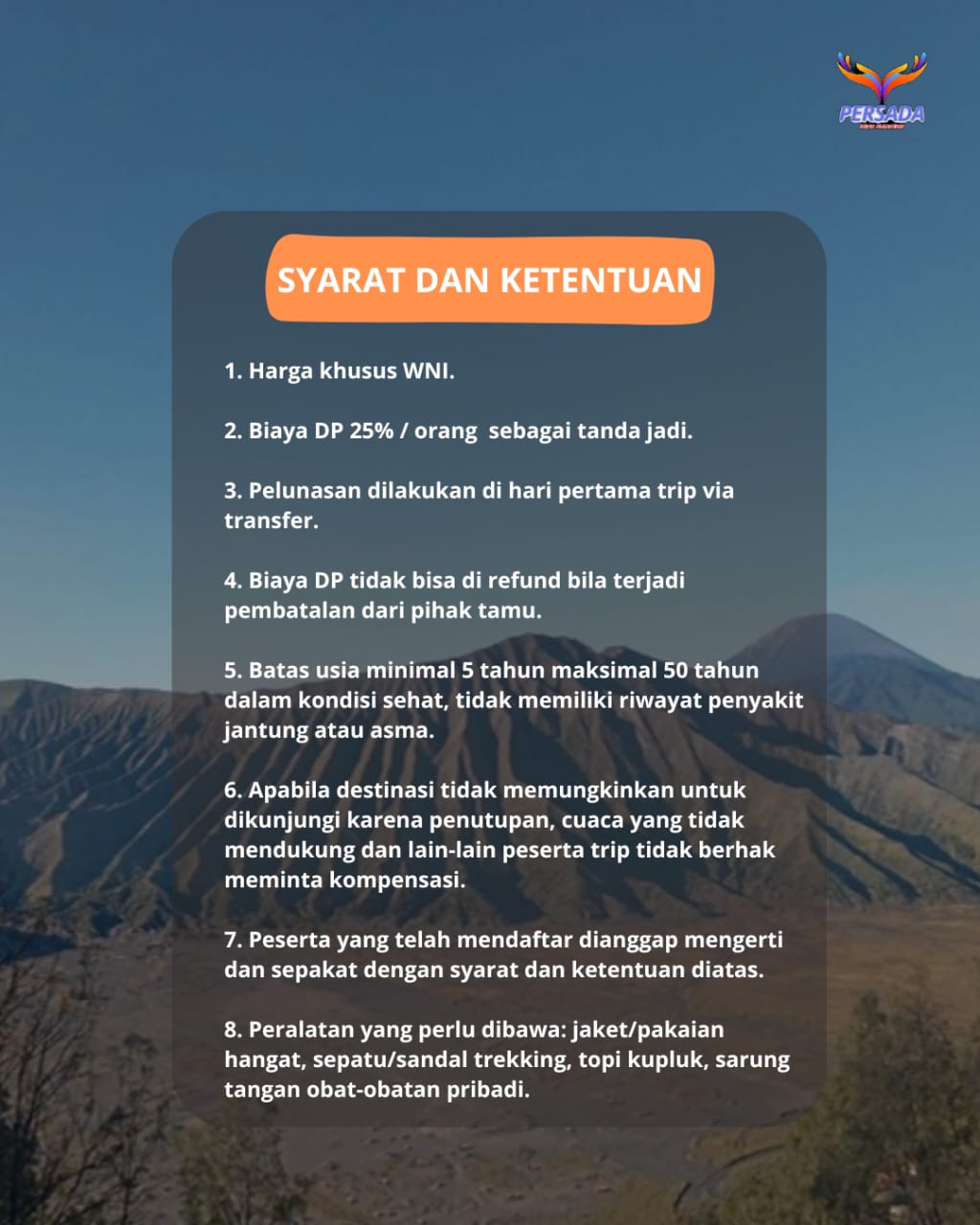 8. Peralatan yang perlu dibawa: jaket/pakaian hangat, sepatu/sandal trekking, topi kupluk, sarung tangan obat-obatan pribadi.
